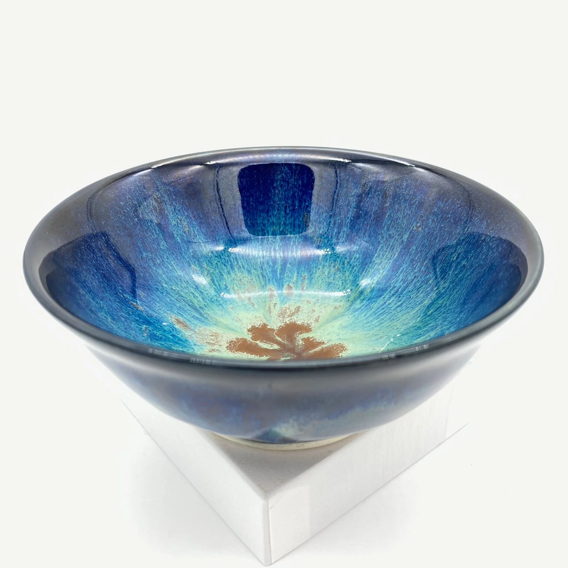 My ceramic bowls and cups are hand thrown on my pottery wheel, fired in my kiln, and then glazed to create shimmering, luminous colors. They are then fired to over 2000 degrees.